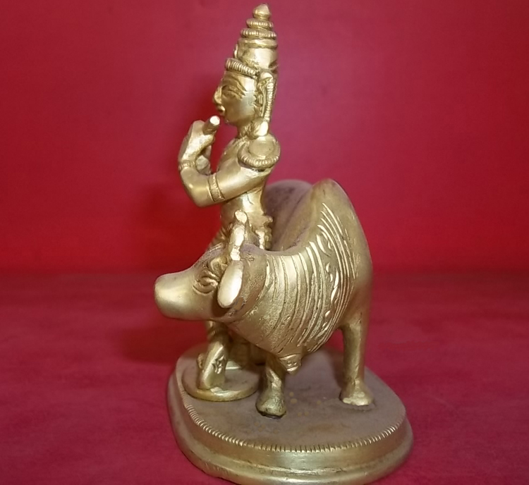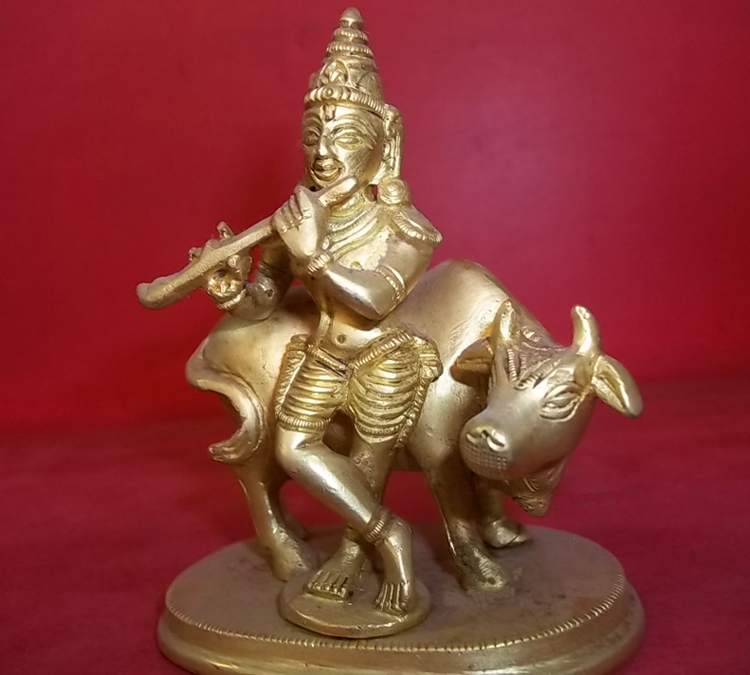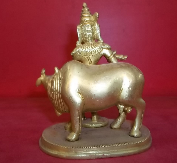Product Description: A simple sculpture of Lord Krishna with cow, playing his flute.